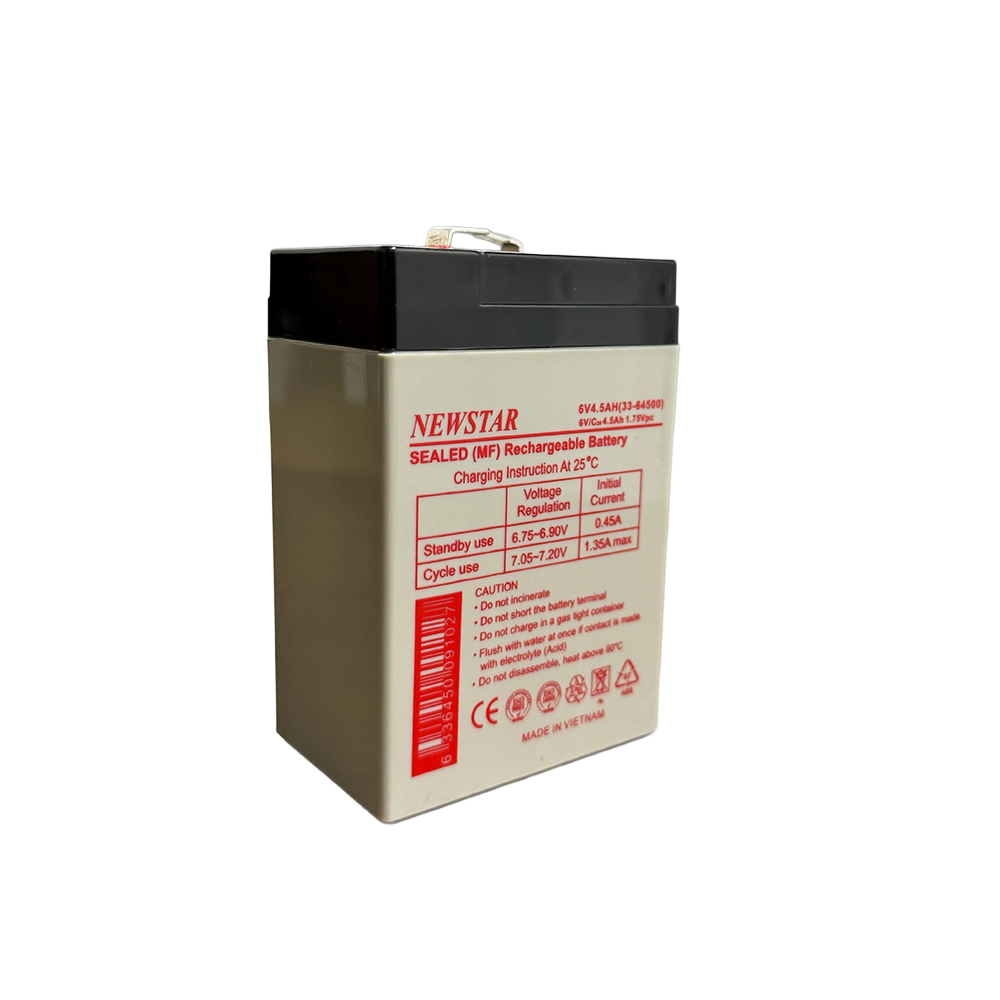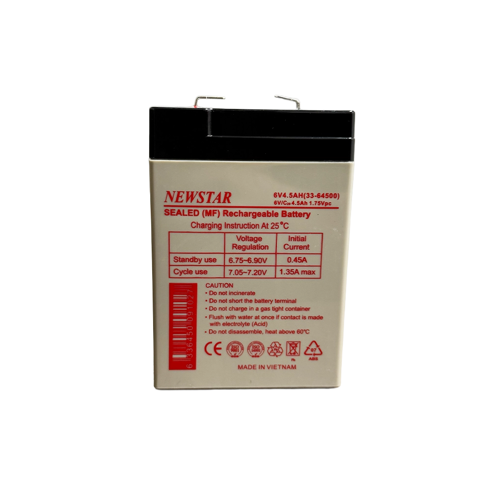 The Newstar 33-64500 (6V 4.5Ah) is a sealed lead acid (VRLA) battery designed for UPS backup and standby power applications. Manufactured using AGM (Absorbent Glass Mat) technology, it provides reliable backup performance, low self-discharge, and maintenance-free operation. With higher capacity than smaller 6V models, it is ideal for alarm systems, emergency power units, control panels, and low-voltage UPS systems requiring dependable standby power.