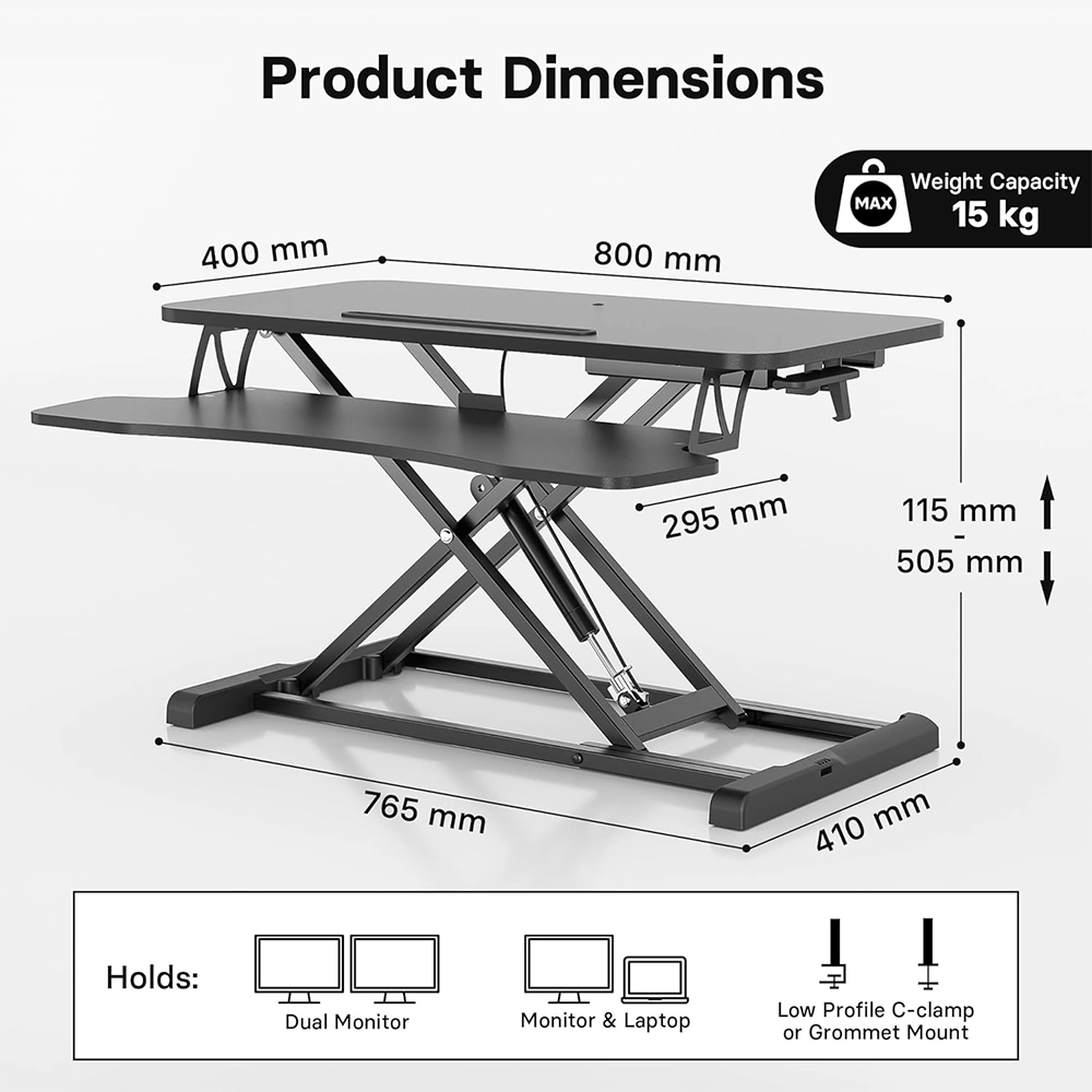 The generous keyboard tray (800 × 260 mm) with 2 kg capacity maintains your wrists in a comfortable position. A wide depth of 580 mm ensures you have space for devices, accessories, and a sufficient working area. With a freestanding installation, you avoid wall mounting, keeping your setup flexible and mobile. Available in elegant Black & Matte Blackand White & Matte White finishes, this desk converter helps reduce back and eye strain while improving productivity in any home office, study, or workspace environment.