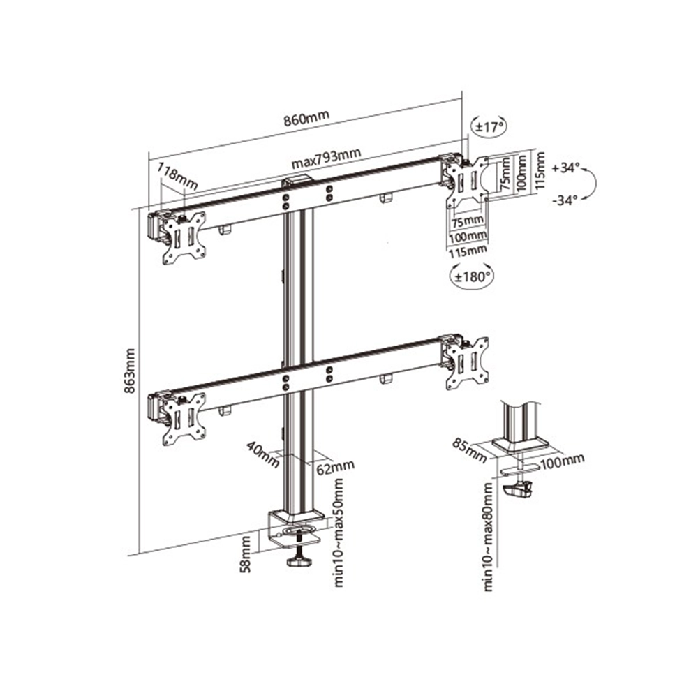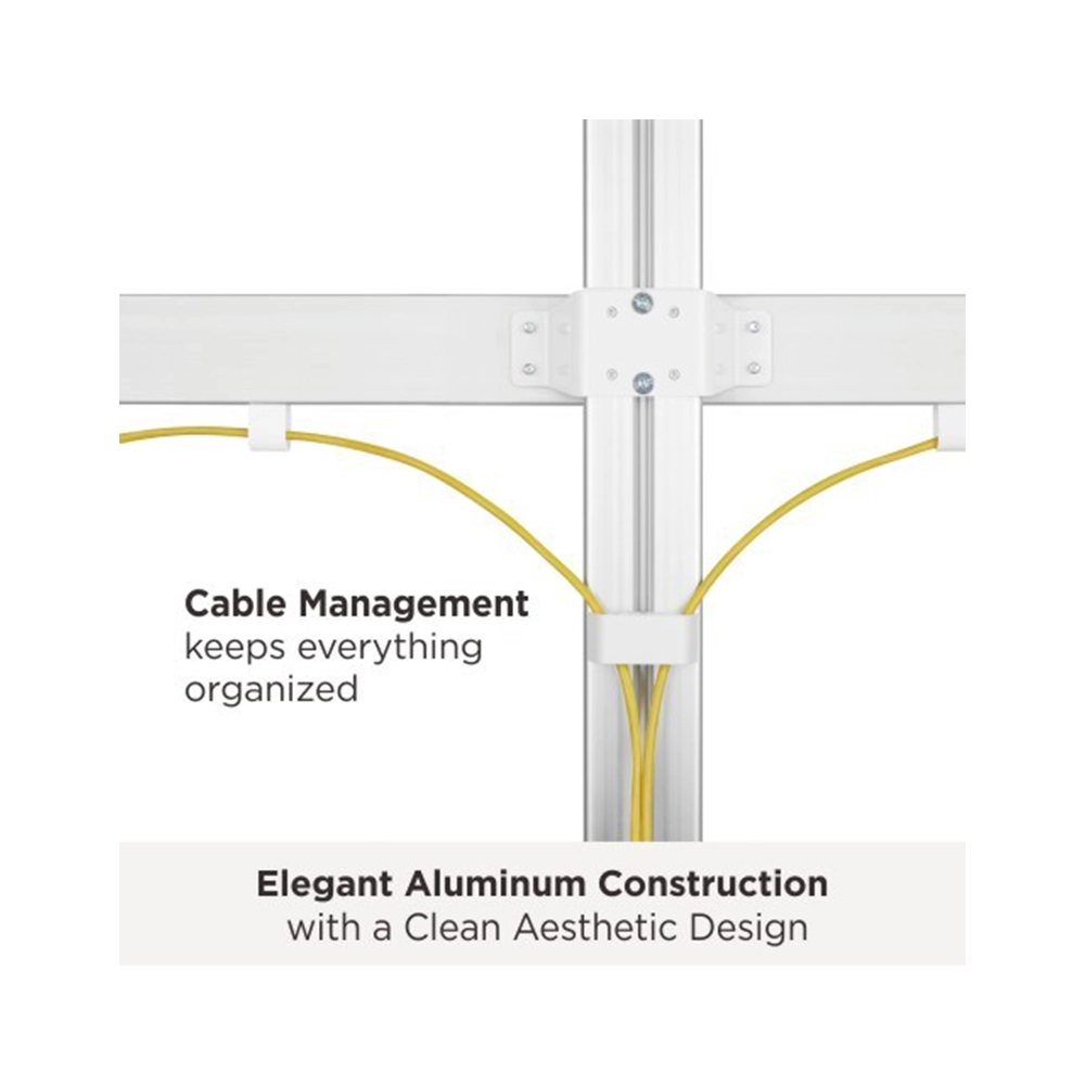 This monitor mount includes both clamp and grommet installation options for more flexible mounting. The clamp fits desks from 10-50 mm, while the grommet option fits 10-80 mm. With quick-release VESA plates, built-in cable management, and a tall 857 mm pole, this monitor stand desk is a smart choice for users who want a polished quad monitor stand with strong support and cleaner cable organisation.
