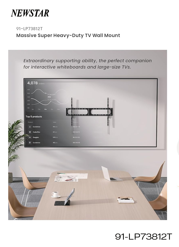 Upgrade your entertainment setup with the Newstar LP73-812T Heavy-Duty Tilt TV Wall Mount — engineered for extra-large TVs up to 140 inches. With a 125 kg load capacity and robust steel construction, it ensures reliable mounting for both home theatres and commercial environments.