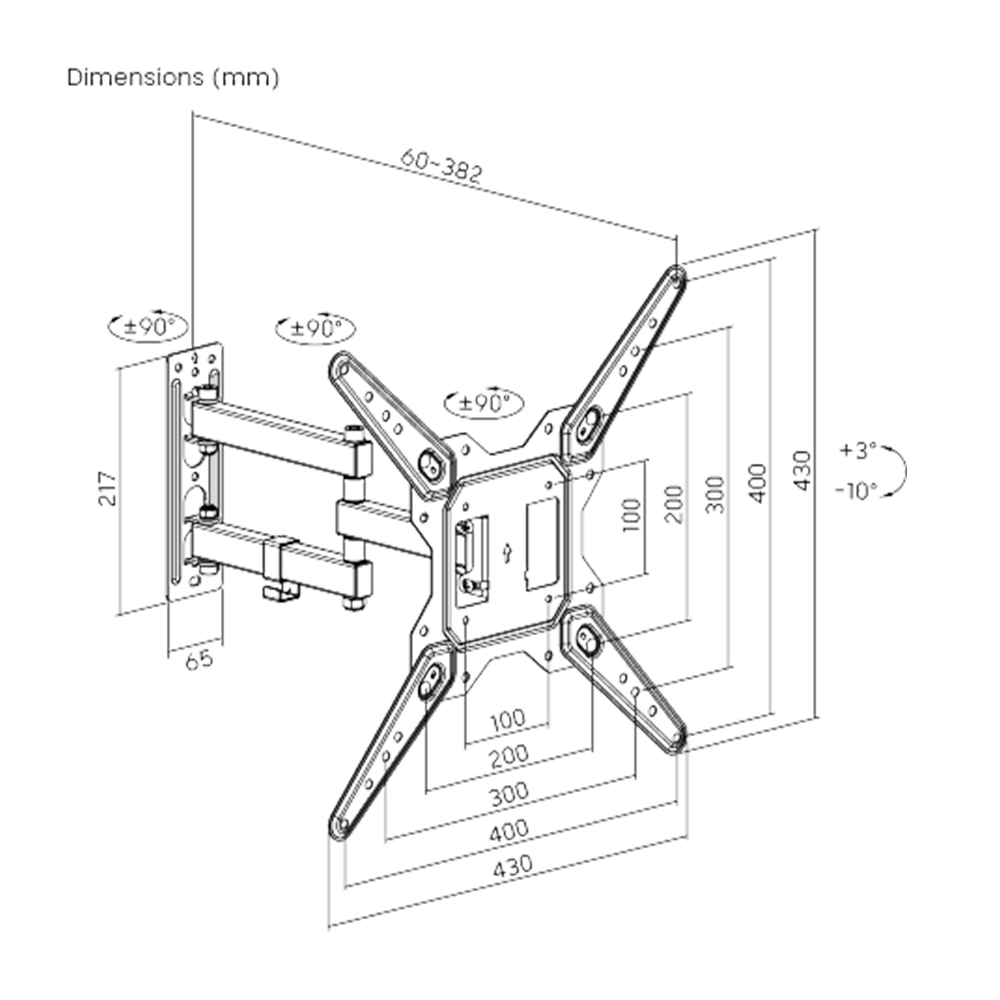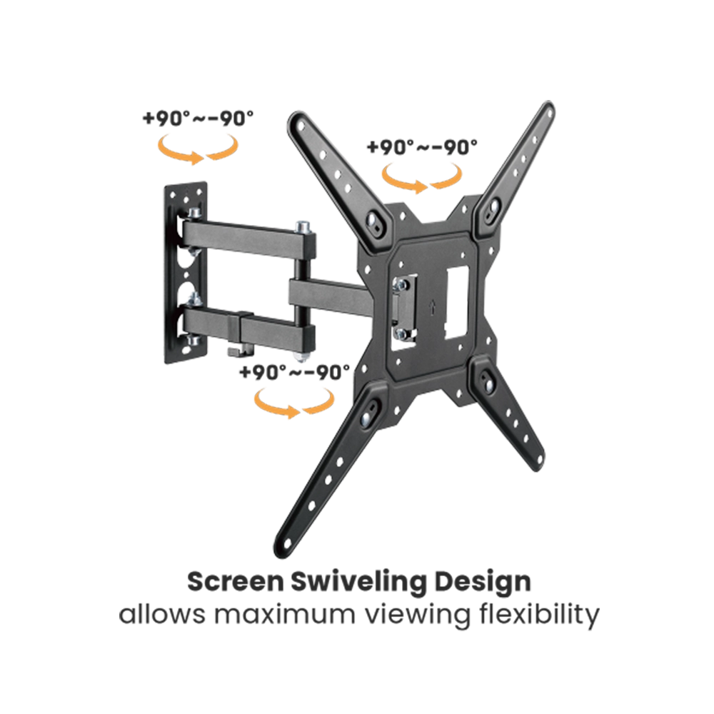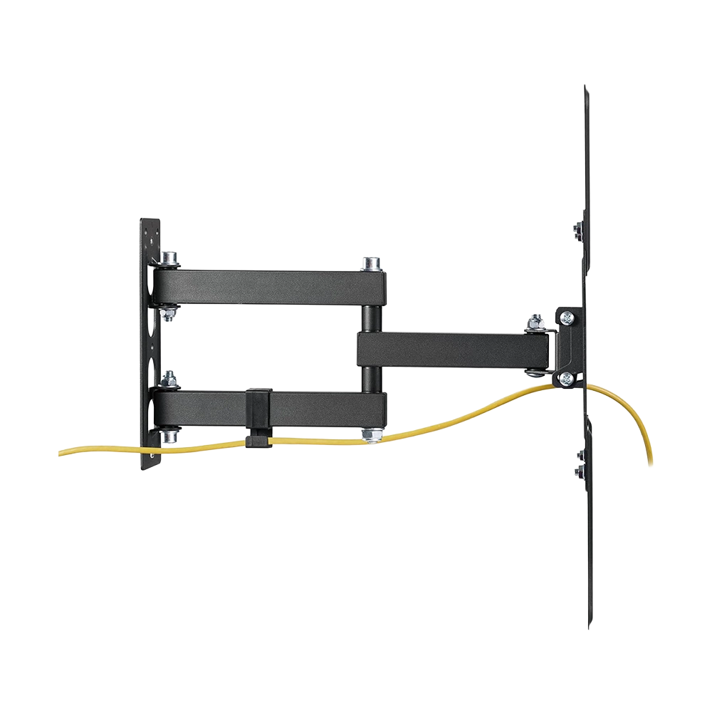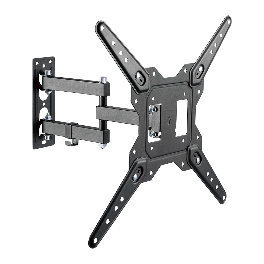 The Newstar 91-LPA68443 Full Motion TV Wall Mount is designed for 23–55 inch TVs with a maximum load of 30kg (66lbs). Built from strength-tested steel, it offers tilt (+3°/–10°) and swivel (±90°) for flexible viewing. The arm extends up to 382mm and retracts to save space, while the integrated cable management keeps wires organised. Compatible with VESA 100×100, 200×100, 200×200, and 400x400mm mounting patterns, making it suitable for both flat and curved TVs.