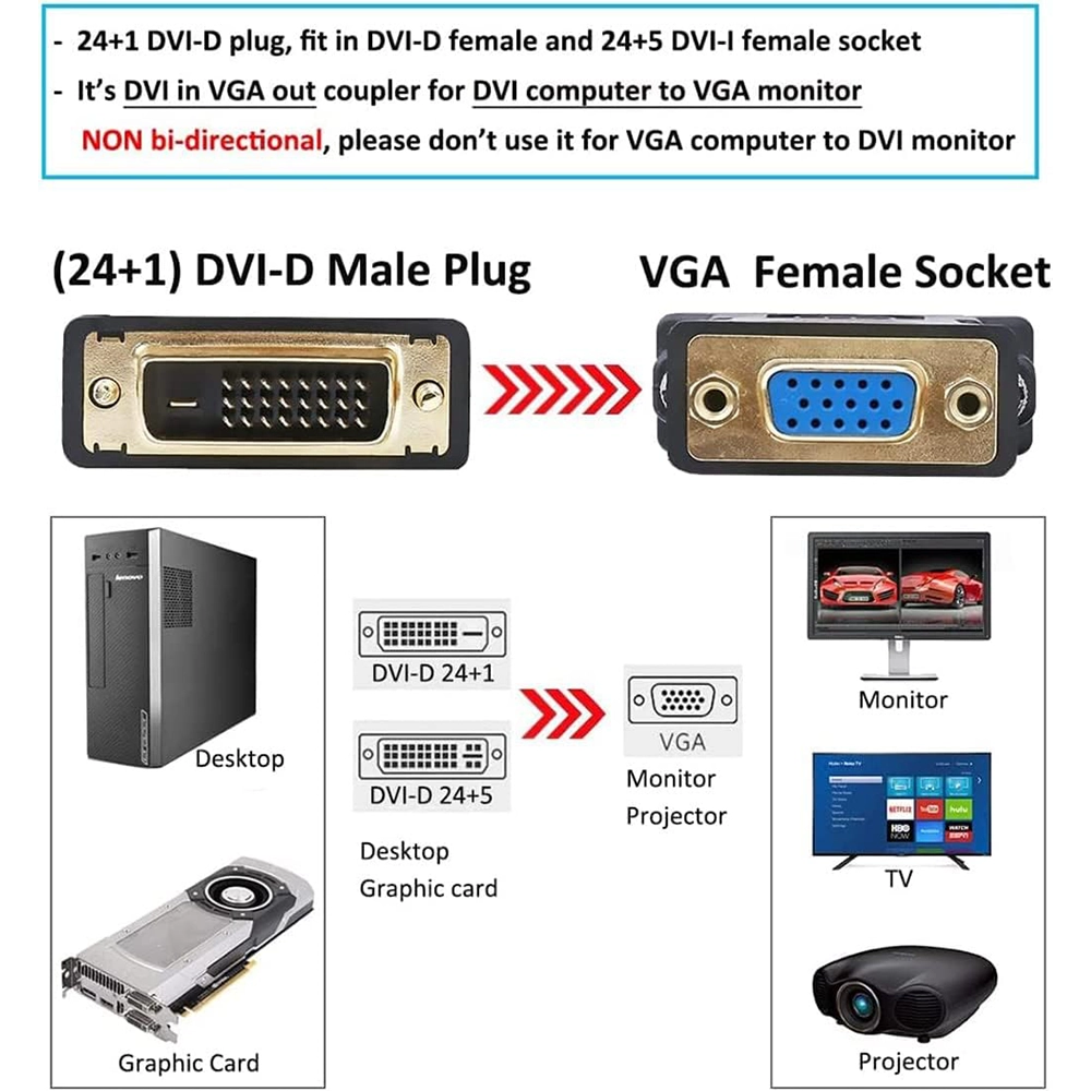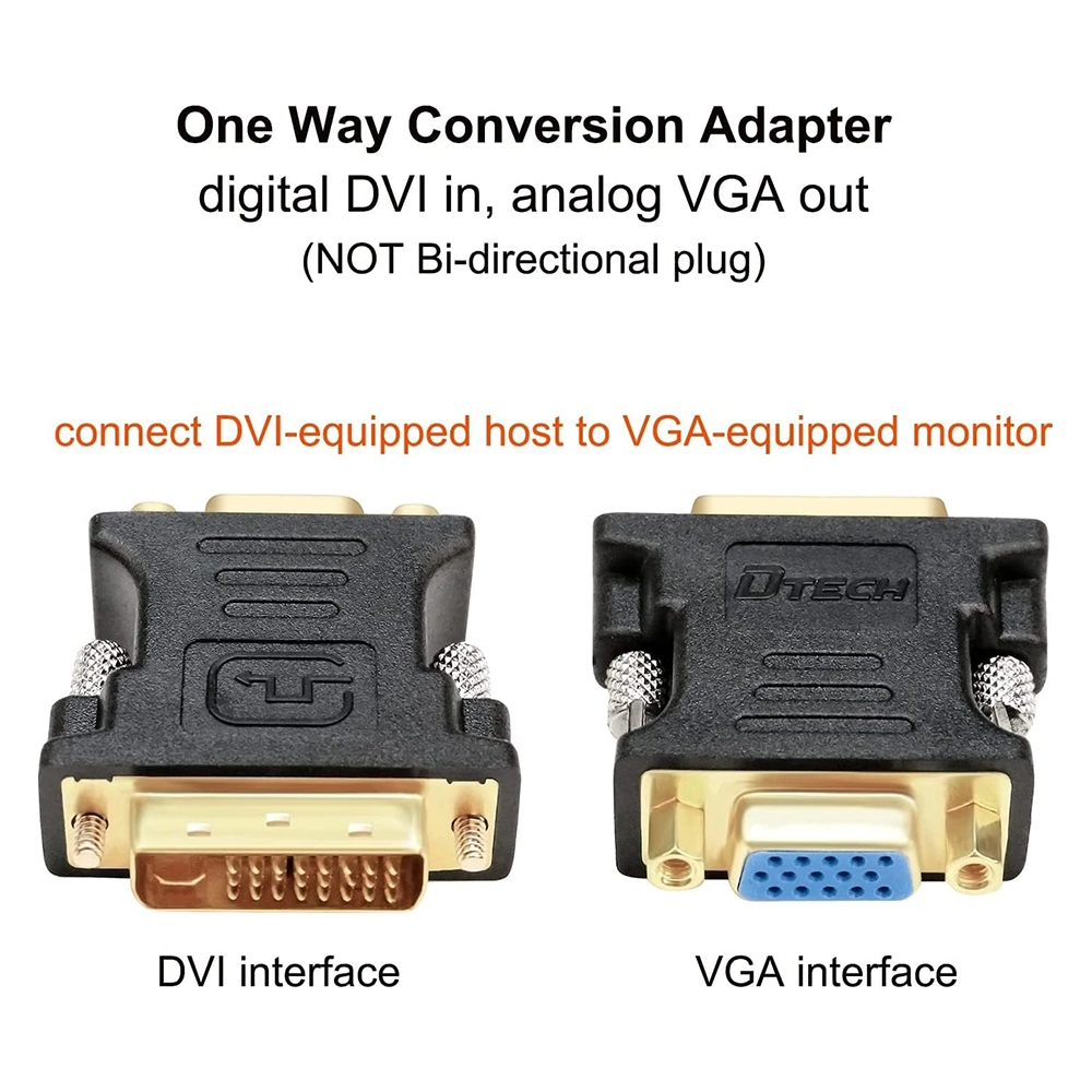 One-way DVI-D to VGA conversion: Converts digital DVI input to analogue VGA output (NOT bi-directional)