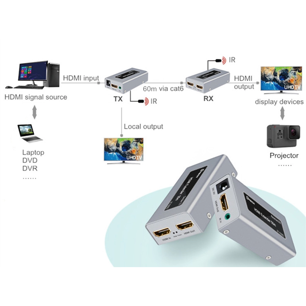 Extends HDMI signals up to 60 metres over a single Cat5e/6 network cable — cost-effective long-distance solution