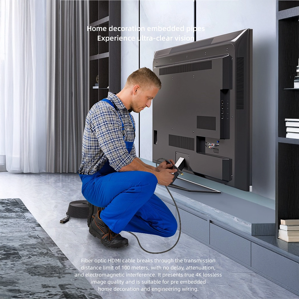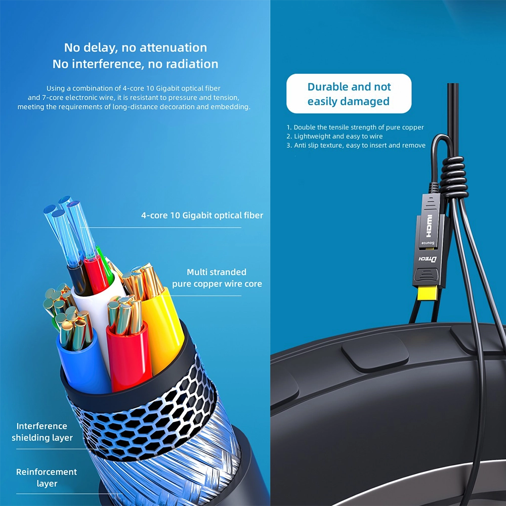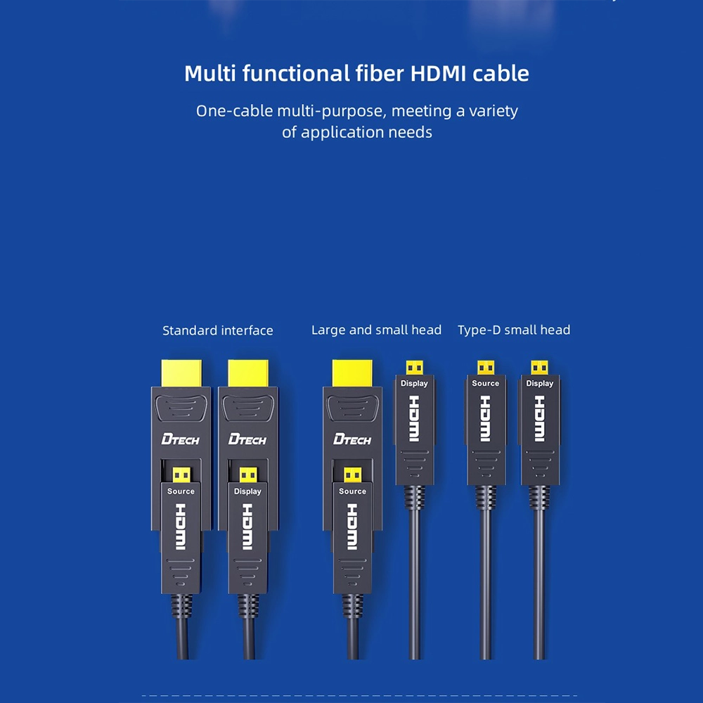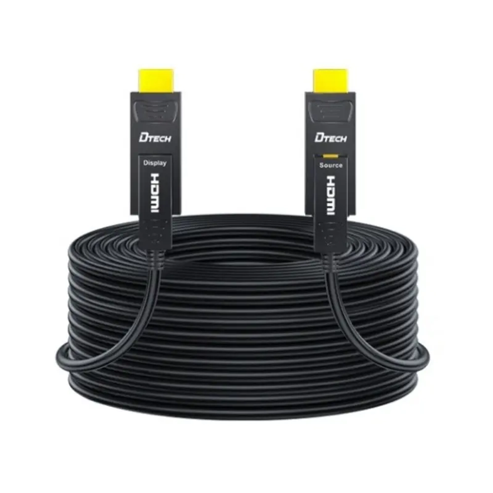 The DTECH Fibre Optic HDMI Cable is a high-performance HDMI 2.0 connection cable designed for reliable long-distance digital video and audio transmission without signal loss. With 18 Gbps high-speed bandwidth and support for 4K @ 60 Hz and 3D HDR content, this fibre optic cable delivers ultra-clear resolution with smooth, vivid visuals â ideal for 4K TVs, projectors, gaming consoles, computers and multimedia systems.