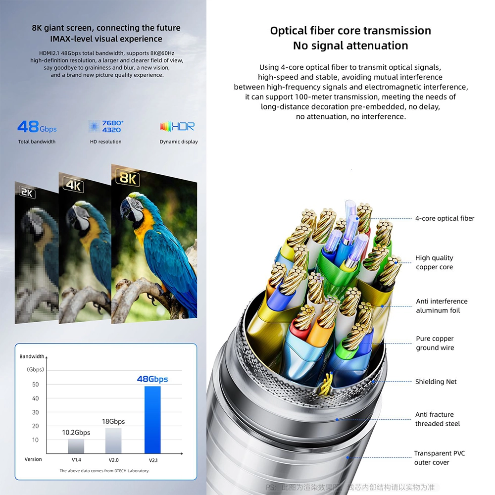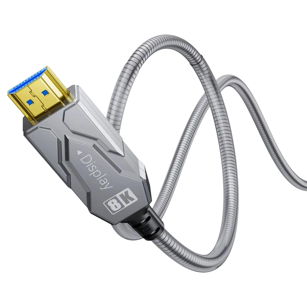 Its robust armor casing provides tensile, compression, waterproof, and anti-bite protection, making it perfect for both indoor and outdoor use, while gold-plated connectors ensure stable and reliable signal integrity. Optical fiber transmission eliminates electromagnetic interference and signal attenuation over long distances, supporting up to 100 m (depending on length). With features like Dynamic HDR, 12-bit color depth, and eARC support for enhanced audio return, this cable delivers an immersive visual and audio experience
